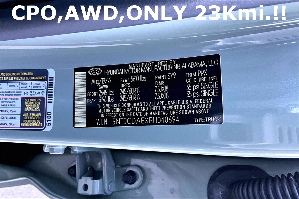 - Condition: Certified Pre-Owned Mileage: 23,253 Stock #: 040694A VIN: 5NTJCDAEXPH040694 Dealer Lot: Long Hyundai