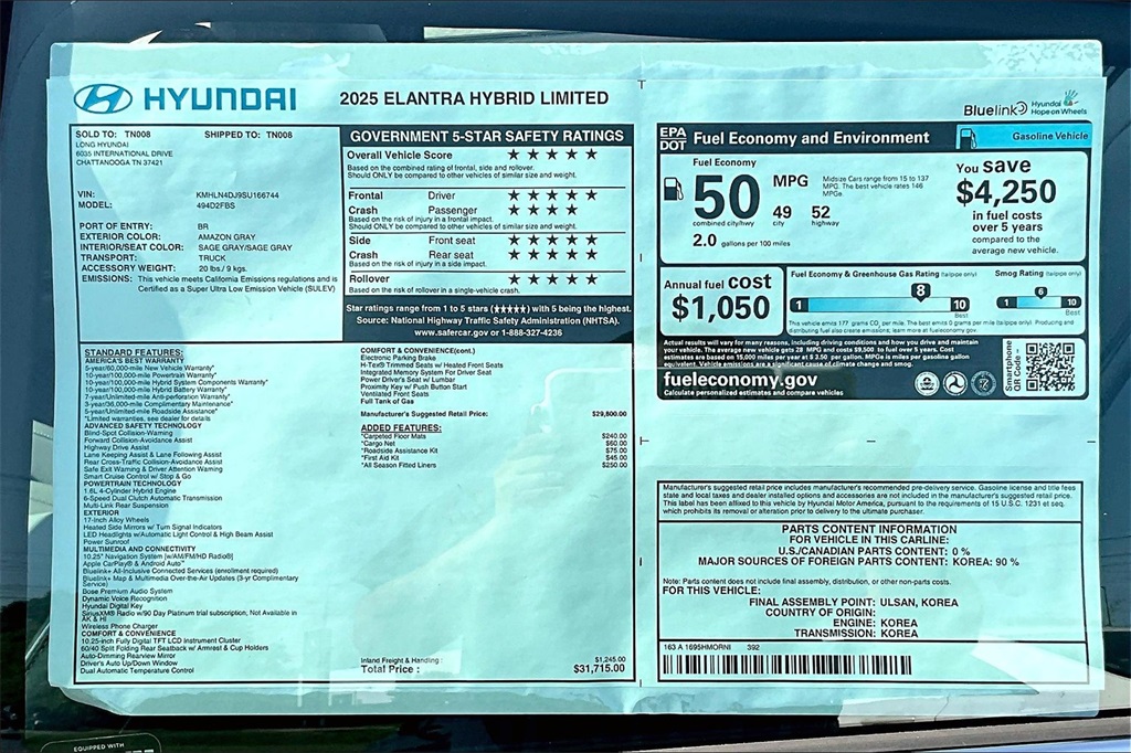 2025 Hyundai Elantra Hybrid Limited Amazon Gray Price includes: $2500 - Hyundai HMF Dealer Choice : $2500 discount. $44.05 per $1000 financed. Available to well qualified buyers who finance through Hyundai Motor Finance. H704. Exp. 02/02/2026