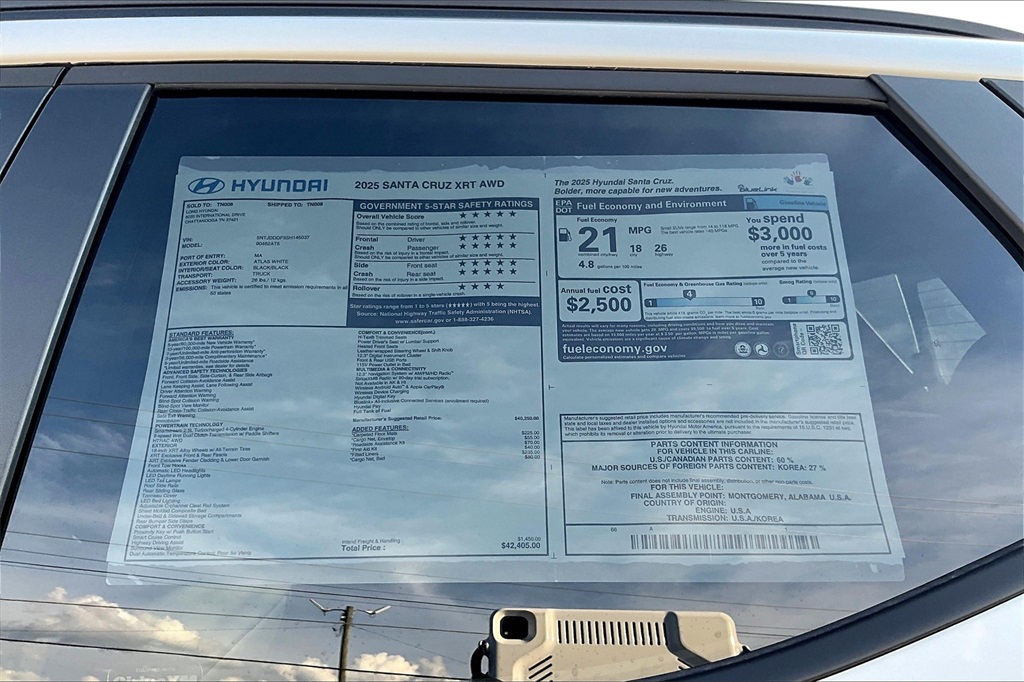 2025 Hyundai Santa Cruz XRT Atlas White Price includes: $750 - Hyundai HMF Dealer Choice : $750 discount. $44.05 per $1000 financed. Available to well qualified buyers who finance through Hyundai Motor Finance. H704. Exp. 02/02/2026