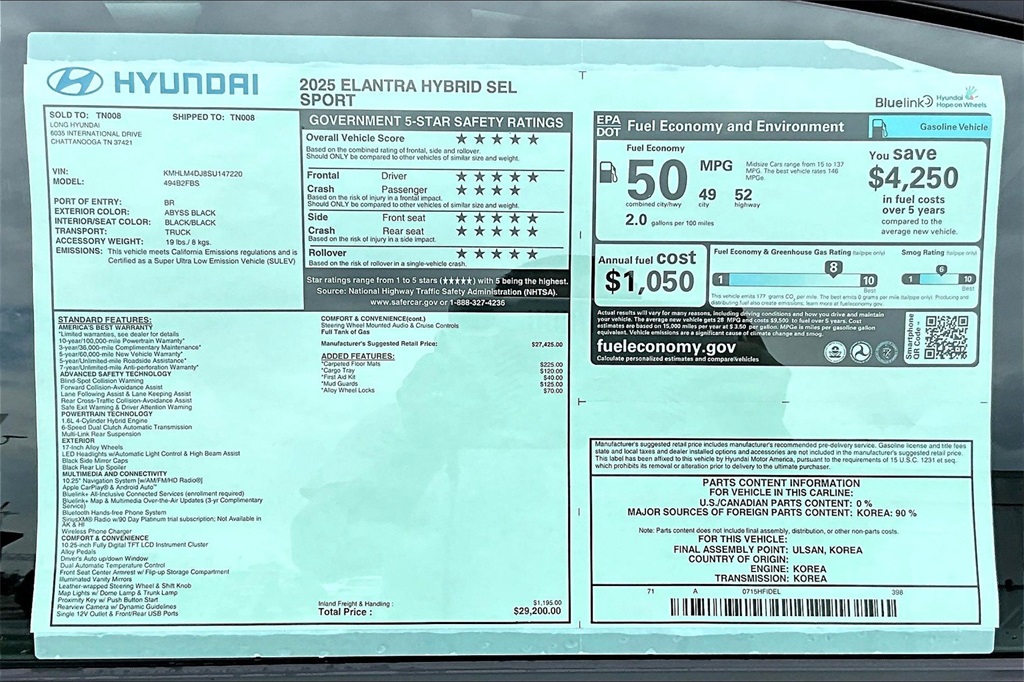 2025 Hyundai Elantra Hybrid SEL Sport Abyss Black Price includes: $2500 - Hyundai HMF Dealer Choice : $2500 discount. $44.05 per $1000 financed. Available to well qualified buyers who finance through Hyundai Motor Finance. H704. Exp. 02/02/2026