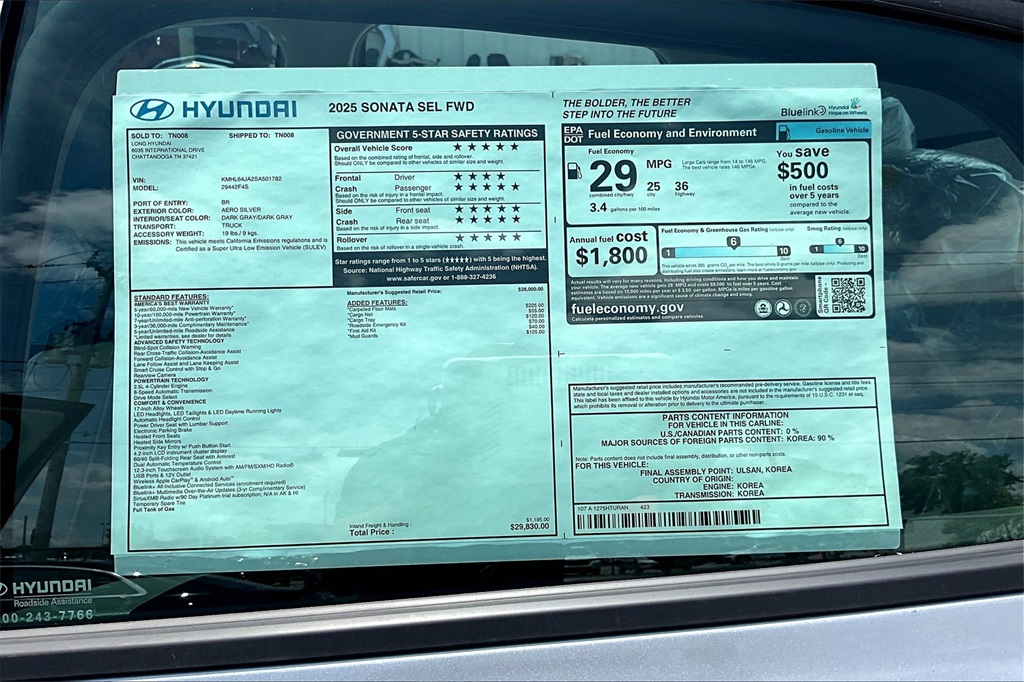 2025 Hyundai Sonata SEL Aero Silver Price includes: $1750 - Hyundai HMF Dealer Choice : $1750 discount. $44.05 per $1000 financed. Available to well qualified buyers who finance through Hyundai Motor Finance. H704. Exp. 02/02/2026