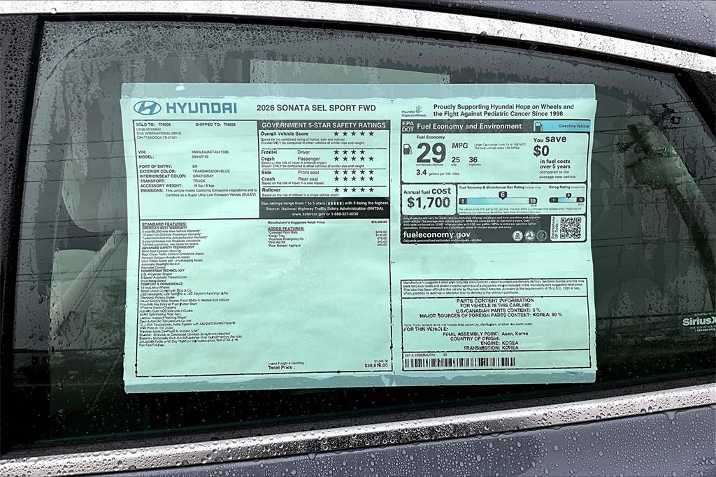 2026 Hyundai Sonata SEL Sport Transmission Blue Price includes: $500 - Hyundai HMF Dealer Choice : $500 discount. $44.05 per $1000 financed. Available to well qualified buyers who finance through Hyundai Motor Finance. H704. Exp. 02/02/2026