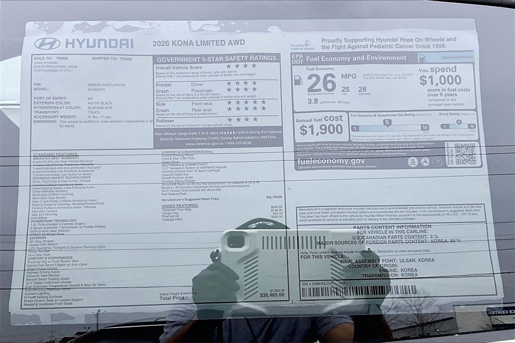 2026 Hyundai Kona Limited Abyss Black Pearl Price includes: $750 - Hyundai HMF Dealer Choice : $750 discount. $44.05 per $1000 financed. Available to well qualified buyers who finance through Hyundai Motor Finance. H704. Exp. 02/02/2026