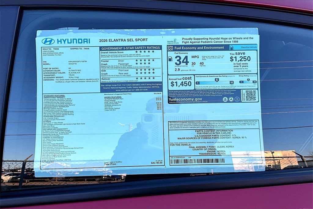 2026 Hyundai Elantra SEL Sport Ultimate Red Price includes: $500 - Hyundai HMF Dealer Choice : $500 discount. $44.05 per $1000 financed. Available to well qualified buyers who finance through Hyundai Motor Finance. H704. Exp. 02/02/2026