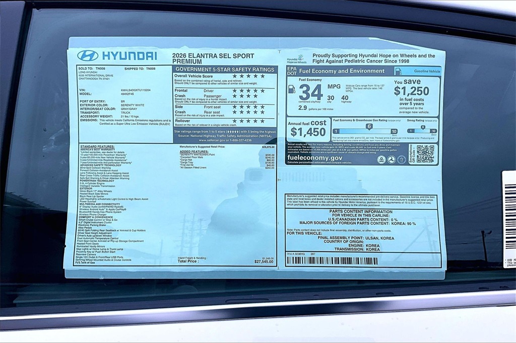 2026 Hyundai Elantra SEL Sport Serenity White Price includes: $500 - Hyundai HMF Dealer Choice : $500 discount. $44.05 per $1000 financed. Available to well qualified buyers who finance through Hyundai Motor Finance. H704. Exp. 02/02/2026