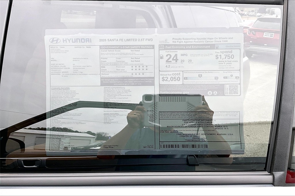2026 Hyundai Santa Fe Limited Ecotronic Gray Matte Price includes: $1500 - Hyundai HMF Dealer Choice : $1500 discount. $44.05 per $1000 financed. Available to well qualified buyers who finance through Hyundai Motor Finance. H704. Exp. 02/02/2026