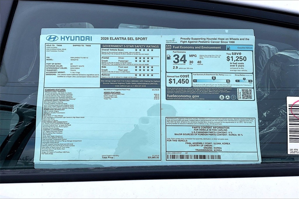 2026 Hyundai Elantra SEL Sport Serenity White Price includes: $500 - Hyundai HMF Dealer Choice : $500 discount. $44.05 per $1000 financed. Available to well qualified buyers who finance through Hyundai Motor Finance. H704. Exp. 02/02/2026