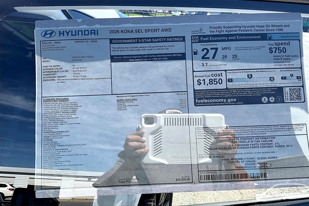 2026 Hyundai Kona SEL Sport Atlas White Price includes: $750 - Hyundai HMF Dealer Choice : $750 discount. $44.05 per $1000 financed. Available to well qualified buyers who finance through Hyundai Motor Finance. H704. Exp. 02/02/2026