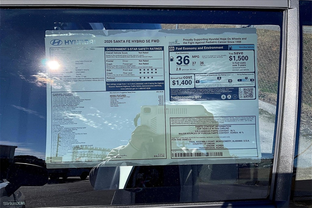 2026 Hyundai Santa Fe Hybrid SE Serenity White Price includes: $1500 - Hyundai HMF Dealer Choice : $1500 discount. $44.05 per $1000 financed. Available to well qualified buyers who finance through Hyundai Motor Finance. H704. Exp. 02/02/2026