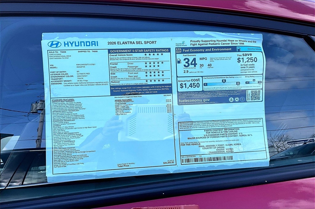 2026 Hyundai Elantra SEL Sport Ultimate Red Price includes: $500 - Hyundai HMF Dealer Choice : $500 discount. $44.05 per $1000 financed. Available to well qualified buyers who finance through Hyundai Motor Finance. H704. Exp. 02/02/2026