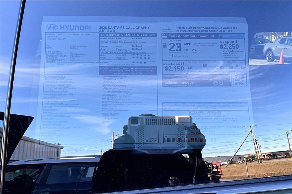 2026 Hyundai Santa Fe Calligraphy Rockwood Green Price includes: $1500 - Hyundai HMF Dealer Choice : $1500 discount. $44.05 per $1000 financed. Available to well qualified buyers who finance through Hyundai Motor Finance. H704. Exp. 02/02/2026